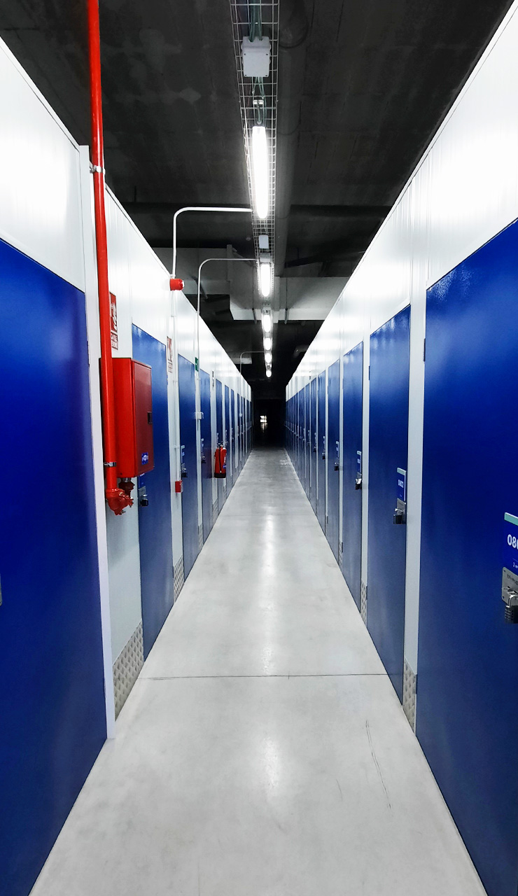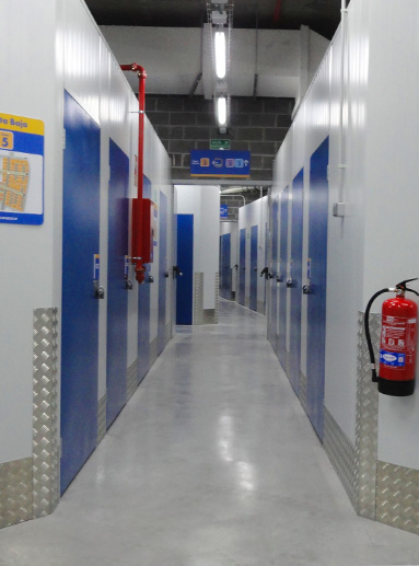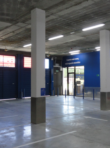 El resultado de la reforma es un espacio moderno y funcional compuesto por una amplia variedad de trasteros o boxes, de diferentes tamaños y configuraciones, que se alquilan según las necesidades del cliente. Estos espacios están diseñados para garantizar la máxima seguridad, limpieza y accesibilidad, permitiendo el acceso las 24 horas del día, los 365 días del año. Además del uso principal como centro de almacenamiento, el proyecto contempla un área comercial destinada al control de accesos y a la venta de productos relacionados con el auto almacenaje, como cajas, candados, estanterías y otros accesorios útiles. El edificio reformado se encuentra en una parcela que ya albergaba construcciones con usos diversos. Concretamente, el conjunto está formado por dos bloques destinados a hotel-aparcamiento orientado al sector de la tercera edad, un tercer bloque con uso comercial y de oficinas, y un sótano habilitado como aparcamiento. La intervención de Bluespace se ha implantado en la zona comercial ubicada en el semisótano, aprovechando al máximo el espacio disponible sin necesidad de nuevas construcciones en altura.