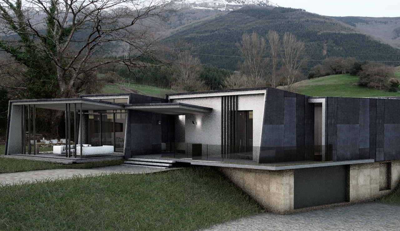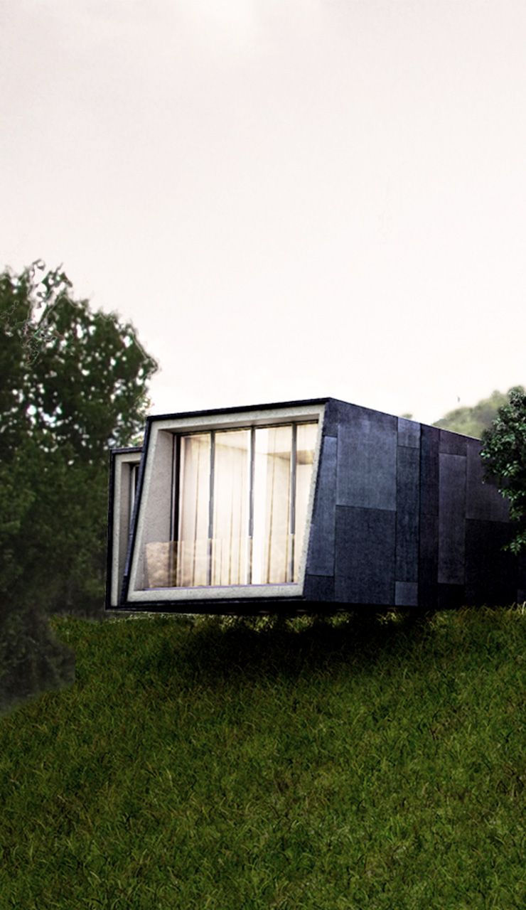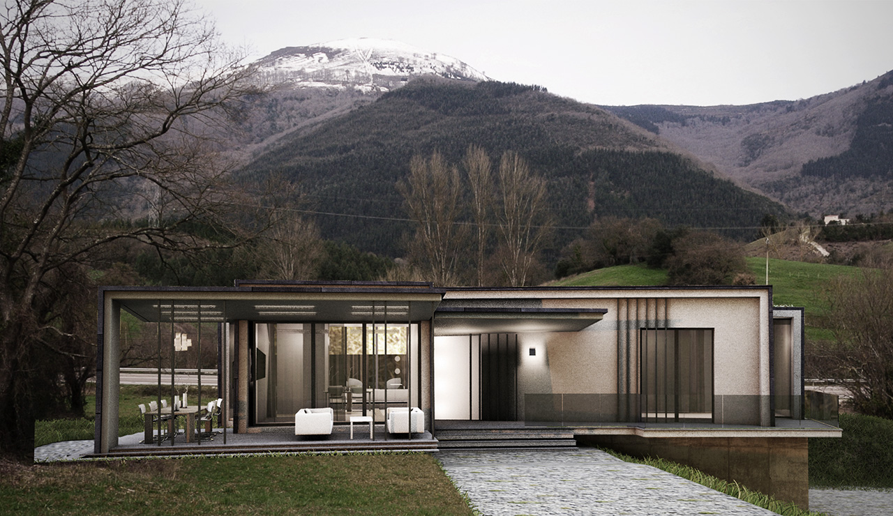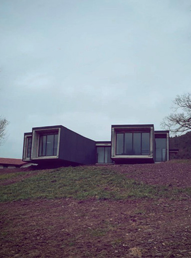 La vivienda encuentra su lugar en un punto inflexivo de la parcela, en un punto ligeramente horizontal de la misma, de manera que el paisaje envuelve la arquitectura. Dos brazos asomándose a la pendiente, para el día y la noche, generan un espacio intersticial destinado al ocio exterior y posibilitan un correcto funcionamiento térmico de la envolvente. En movimiento, varios aros o casquillos que se introducen los unos en otros aportan profundidad y dinamismo a la casa, reforzando su carácter escultórico y su integración con el entorno.