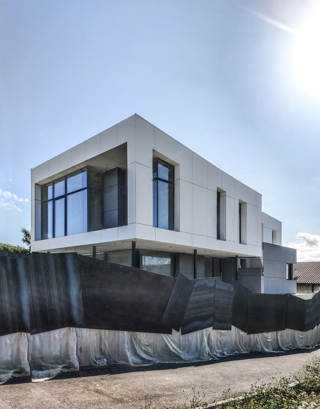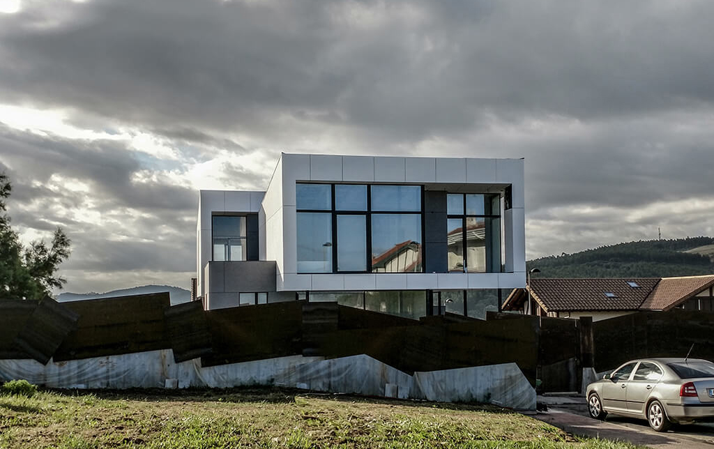 La fachada ventilada está prácticamente finalizada. Hemos utilizado un sistema de paneles de fibrocemento de gran formato y ligereza. Un colchón de aire envuelve la casa, incluidas las zonas de los falsos techos de los porches, proporcionando un comportamiento térmico homogéneo en toda la “cáscara” del edificio.