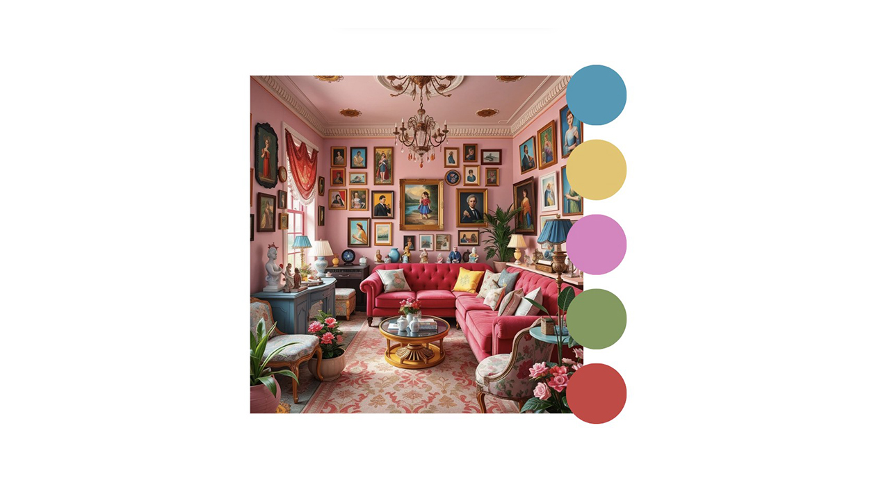 • Colores llamativos y saturados: La paleta cromática del Kitsch incluye tonos vibrantes como el rosa chicle, azul eléctrico y amarillo neón. Se combinan de manera inesperada para crear contrastes impactantes.